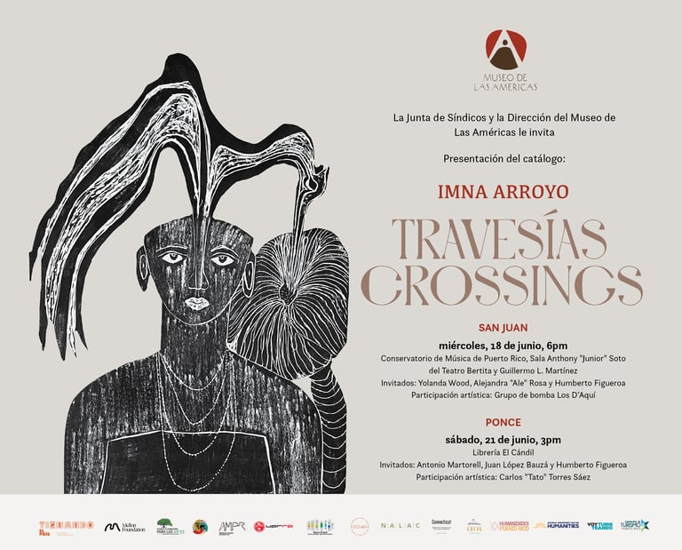 El Museo de Las Américas es el gestor del libro-catálogo Travesías/Crossings de la exhibición homónima de la artista, Imna Arroyo Cora, presentada en el año 2023. El arte de Imna Arroyo toma protagonismo con este lanzamiento que rinde homenaje a la memoria ancestral, el viaje y la resiliencia en una publicación encuadernada que consta de 161 páginas a color. El libro incluye los textos curatoriales de Yolanda Wood, Benjamín Ortíz y Humberto Figueroa Torres, además de autores invitados, como el Maestro Antonio Martorell.