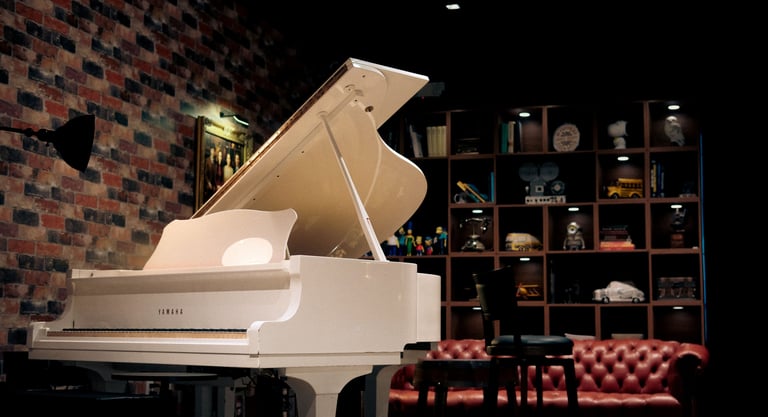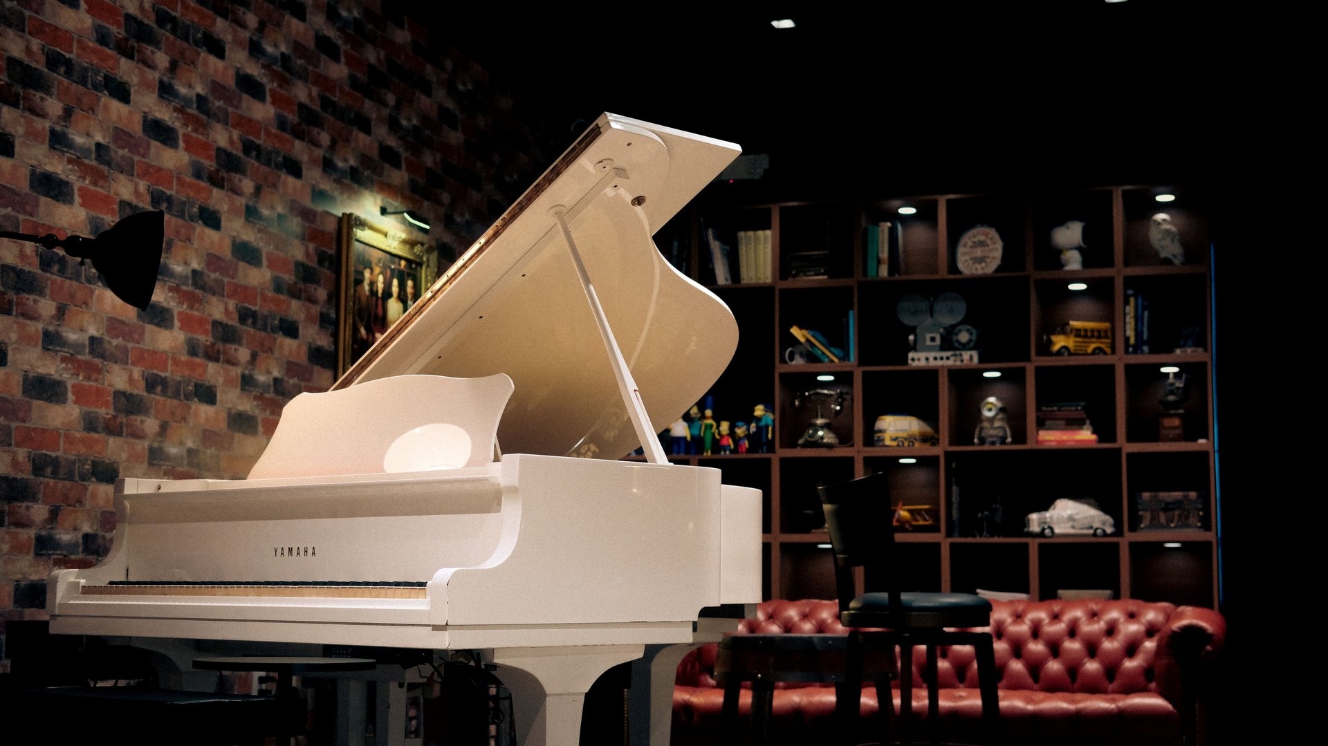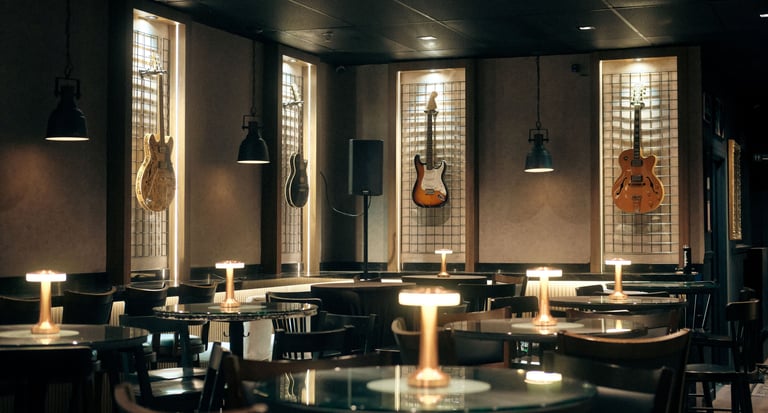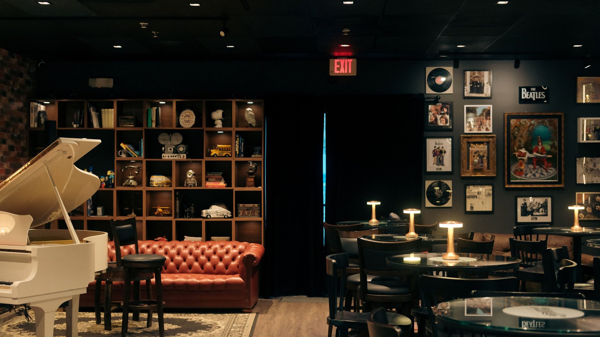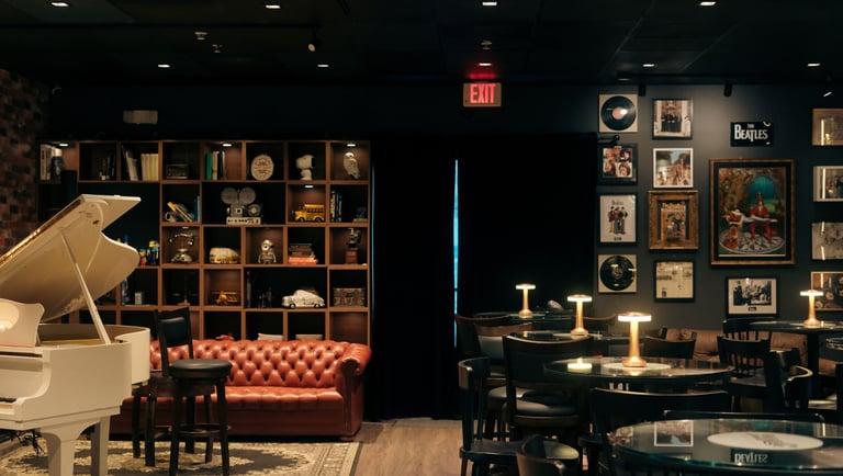 Al cruzar las puertas del Vintage Room, los visitantes son transportados a otra era. La decoración, cuidadosamente elegida, refleja un estilo vintage que combina tonos marrones y colores vino, creando una atmosfera acogedora y nostálgica. Cada rincón del lugar cuenta una historia: desde su biblioteca repleta de obras literarias hasta la chimenea que invita a disfrutar de momentos de calma. Un piano de cola blanco resalta en el ambiente, junto a una impresionante colección de instrumentos musicales que adornan el lugar.