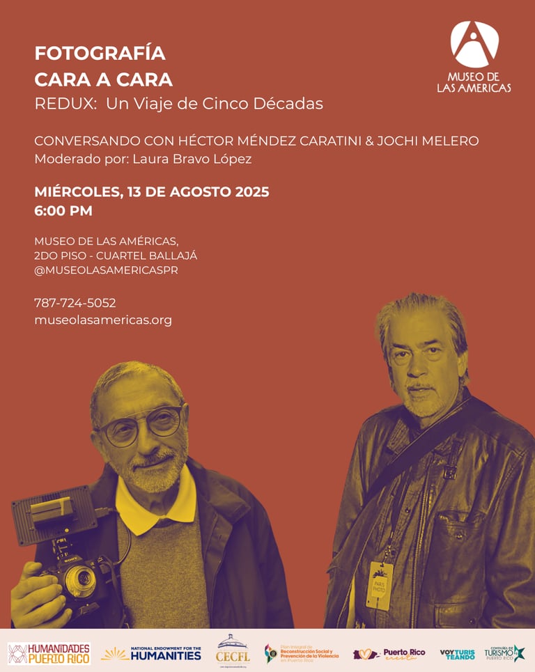 La primera de ellas será el conversatorio Fotografía cara a cara: REDUX – Un Viaje de Cinco Décadas, y tendrá lugar el miércoles, 13 de agosto a las 6:00 p.m. Este diálogo reunirá a los veteranos fotógrafos Héctor Méndez Caratini y Jochi Melero, y será moderado por la curadora y académica Laura Bravo López. Esta conversación, enmarcada en la exposición REDUX, propone una mirada retrospectiva sobre cinco décadas de creación fotográfica en Puerto Rico, y es una oportunidad única para escuchar las motivaciones, influencias y visiones de dos de los exponentes más destacados de nuestra fotografía contemporánea.